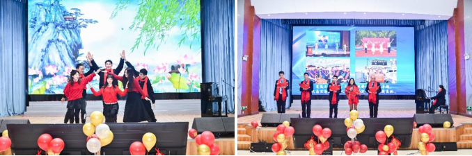 联欢会在海事系热情洋溢的《敬业阵线联盟》歌舞中拉开序幕,老师们将专业精神与热情活力完美融合,展现了对教师职业的热爱;导航系改编的歌曲《我相信》,怀揣着对未来的无限憧憬和坚定信念,激励着大家在新的一年里勇敢追逐梦想;航海系呈现的朗诵节目《出师表》不仅展现了古代智者的忠诚与担当,更与航海精神相得益彰;黄沙万里长,何处传来驼铃声,科普基地的老师们献上了一首充满历史沧桑与家国情怀的经典歌曲《梦驼铃》。