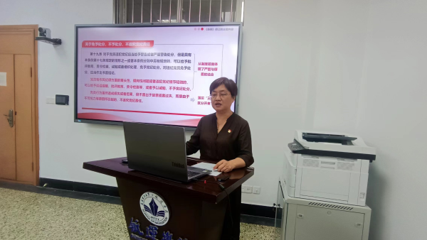 赵娟娟书记讲授纪律党课。她以《认真学习贯彻纪律处分条例,推动形成遵规守纪高度自觉》为题,围绕《中国共产党纪律处分条例》修订的历程、正确理解《条例》修订的背景意义及主旨要义、《中国共产党纪律处分条例》修订的主要内容三个部分,结合教育系统违纪案例分析和学院当下正在开展的学校“智慧纪检”预警信息自查自纠工作,带领大家学习解读《条例》内容,提高学纪、知纪、明纪的自觉意识,不断增强遵规守纪的行为自觉。