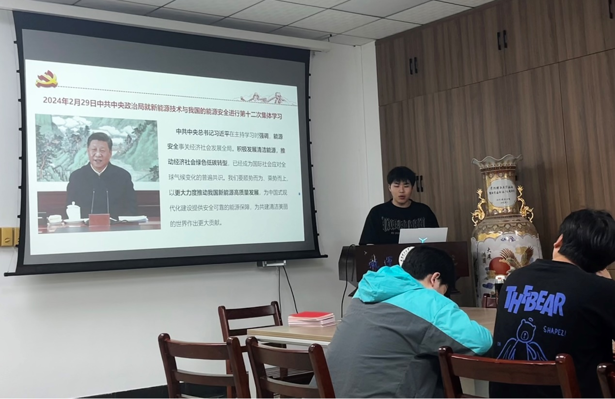 会议伊始,秦瑞朋同志带领全体党员共同学习了《习近平总书记在中共中央政治局第十二次集体学习上的重要指示精神》。秦瑞朋同志强调作为水上专业的研究生,航运是国家能源运输的重要生命线,我们需要深刻认识推动新能源高质量发展和保障国家能源安全的重要性,立足专业所学,潜心开展研究。