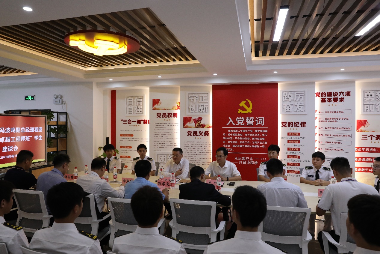 在启航书院党团之家,冯波鸣副总经理一行与“武汉海顺卓越工程师班”学生座谈交流。首先,赵经副书记代表学校对冯波鸣一行来访表示热烈欢迎,向招商局集团长期以来对学校发展和人才培养的关心和支持表示感谢,希望双方深化交流,共同推进高质量发展,为培养更多的优秀人才和推动社会进步做出更大贡献。同时,他殷切希望卓越班的同学们:要涵养家国情怀,要将自身发展融入中华民族伟大复兴的新征程,促进德智体美劳全面发展,将来为交通强国、海洋强国作更大贡献。