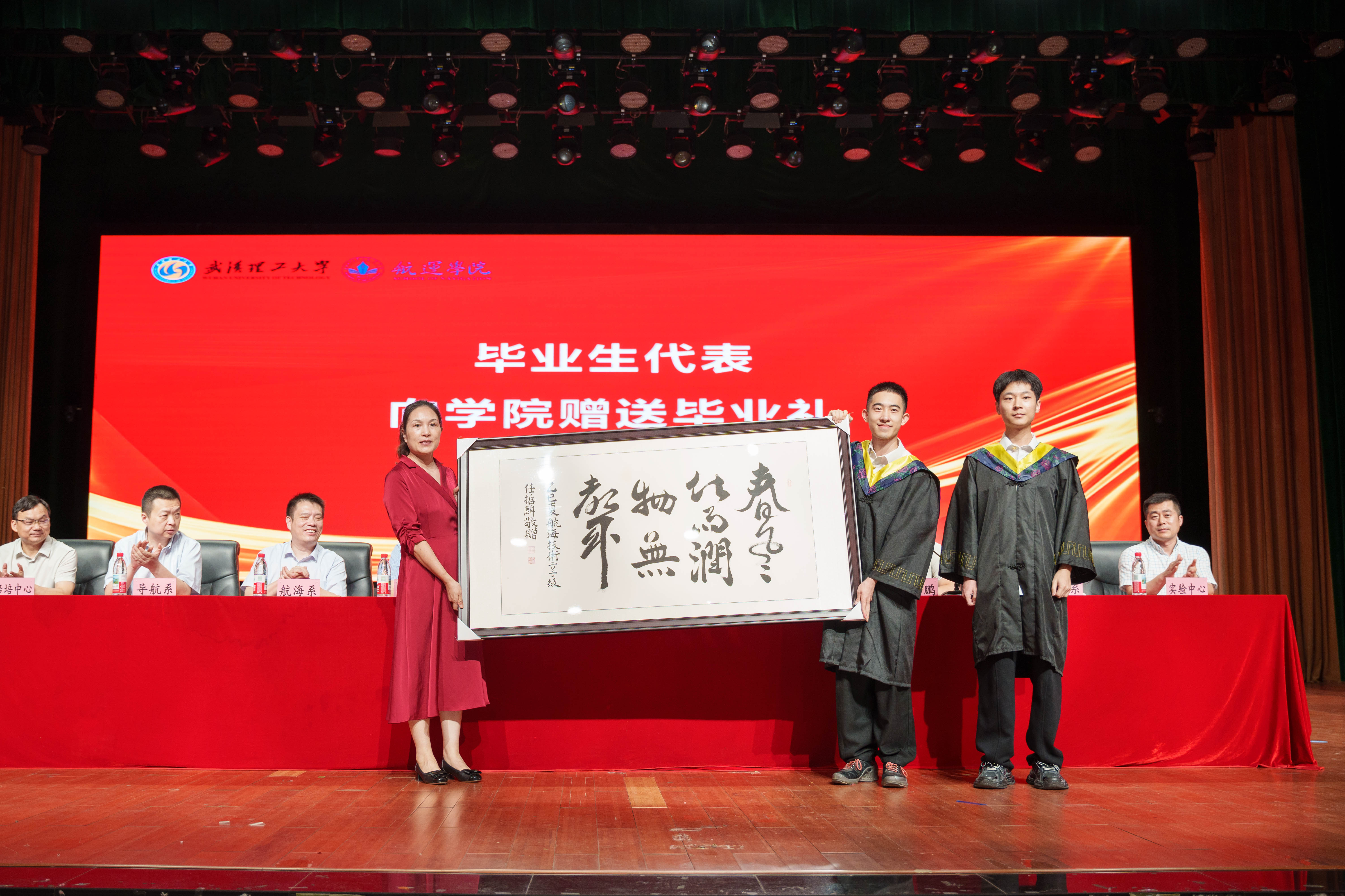 党委书记侯俊代表学院接受由毕业生代表回馈的毕业礼—任哲麟同学创作的书法作品《恩泽》,该作品向学院师长的关心和培养表示衷心感谢,同时也对即将毕业的同学们送上真诚祝福。