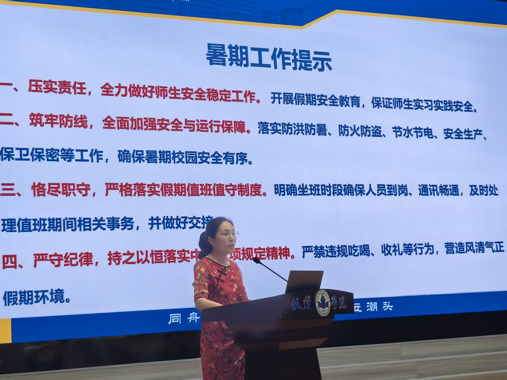最后,院党委书记侯俊对暑期工作进行安全提醒。她要求全体教职工严格落实中央八项规定精神,严守纪律红线,持续加强作风建设;严格执行假期值班值守制度,切实履行职责,强化安全保障措施,确保学院安全稳定。