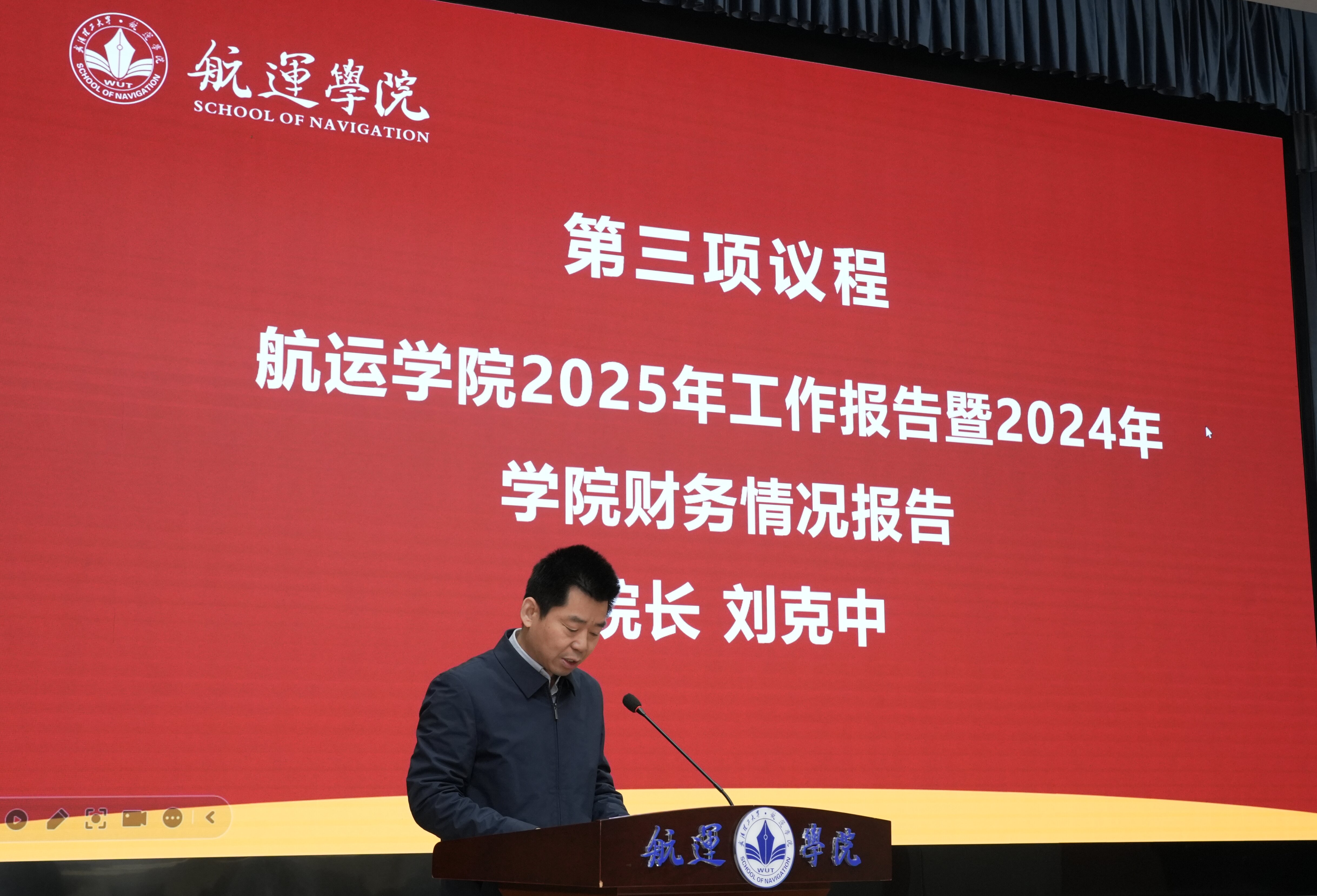 院长刘克中以《扛牢使命担当、凝聚奋进合力、以笃行实干推进学院事业高质量发展》为题作学院2025年工作报告。报告从师资队伍建设、人才培养、专业建设、科学研究、社会服务等方面回顾了学院2025年工作。报告认为,2025年是“十四五”收官与“十五五”谋划的关键之年,一年来学院坚持以习近平新时代中国特色社会主义思想为指导,锚定内涵式高质量发展主线,以党建为引领、立德树人为根本、办学80周年为契机、重点任务为抓手,务实笃行、聚力攻坚,各项工作稳中有进,发展动能持续增强。报告指出,2026年学院将紧扣教育、科技、人才一体化统筹推进要求,锚定立德树人根本任务,聚焦青年人才引育、办学条件改善、专业内涵建设、科研团队建设等重点工作精准发力、攻坚突破,确保2026年各项目标任务高质量完成。