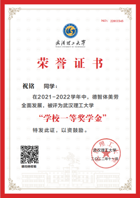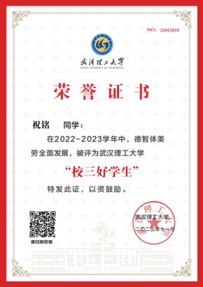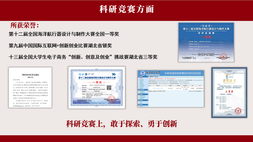 在校期间祝铭多次参与国家级、省部级科研项目和学科专业竞赛,荣获全国海洋航行器设计与制作大赛全国一等奖、第十三届挑战杯创业计划竞赛湖北省金奖、中国国际“互联网+”大学生创新创业大赛湖北省银奖、全国大学生电子商务“创新、创意及创业”挑战赛湖北省三等奖等奖项,项目期间申请取得2篇软件著作和一项国家发明专利。
