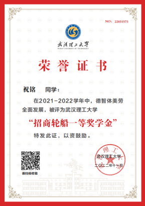 在专业学习方面,祝铭同学始终保持热情,为成为卓越航运人才不断汲取知识,已修课程中23门课程获95分及以上成绩,39门课程获90分及以上成绩,连续两年平均学分绩点、综合测评分数年级第一,多次受邀至低年级分享学习经验,将自己所学分享,帮助学弟学妹积极学习。先后荣获卓越奖学金(全校仅10人)、国家奖学金、招商轮船一等奖学金、校三好学生、校优秀易班干部。