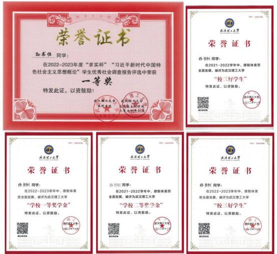 由于大学学习模式与高中差异巨大,孙书恒大一期末成绩不甚理想。“世上无难事,只要肯登攀”是孙书恒的座右铭,通过自我反思个人的踏实努力与师长的帮助下,孙书恒逐渐掌握了学习方法,成绩稳步提升。在大三结束时,平均综测排名位列专业第四,并获得校三好学生、校一等奖学金、招商轮船一等奖学金等荣誉称号。