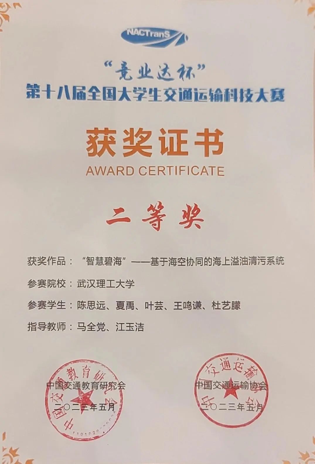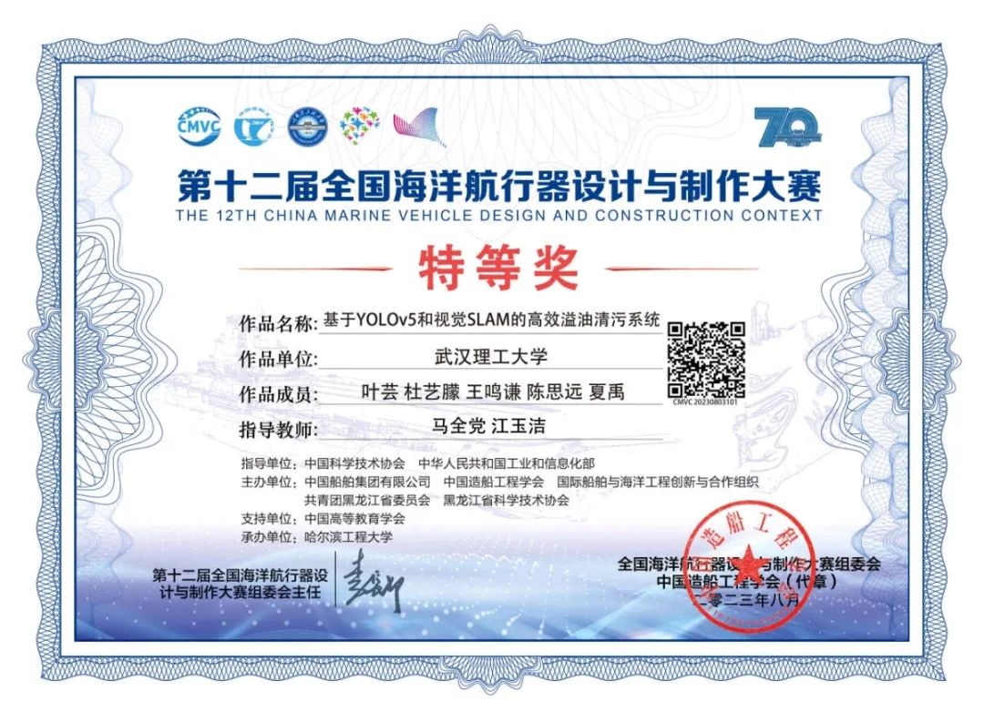 回忆大学四年得到科创经历,她说:“科创经历已经成为我大学生活中浓墨重彩的一笔,我的各方面能力都通过参加科研工作得到了大幅提升。”在课题组中,她将专业课程上所学的知识迁移到科技创新中,与小组成员聚焦于溢油清污,通过长期调研与技术改进,一同研发基于YOLOv5和视觉SLAM的高效溢油清污系统,成果荣获第十二届全国海洋航行器设计与制作大赛全国特等奖、第十八届全国大学生交通运输科技大赛全国二等奖