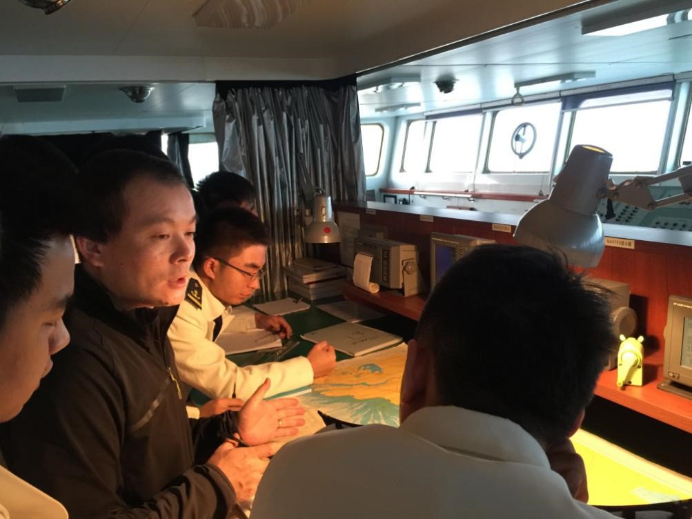 与学生同舟共济之时,他爱琢磨实习指导方法,总在思考和摸索如何提高学生对自己倾囊相授的航海技能和经验的兴趣,提升教学效果。经过几年的实践,他摸准了船上实习指导的基本规律,做到教学环节的精准把控。首先,周密安排分组任务,确保每组学生都能涵盖实习目标任务,同时,组与组之间互相衔接,配合实习船运营顺畅作业。第二,采用多种教学模式,如:进行情景演练,让学生分别承担驾驶台各个角色来完成真实的航行任务;组织学生专题演讲,选题由老师分配或学生自选,老师讲评指导。这些模式能吸引学生快速进入船员角色,理论联系实际,主动深入思考问题,有效提升了实习教学效果。第三,注重现身说法,每天陪伴不同组的学生参加航行值班、甲板工作锻炼和厨房帮厨等,通过针对性教学、手把手指导,第一时间纠正学生理解理论和实际操作中的问题,提升学生的动手能力。第四,循序渐进总结成效。利用晚自习时间,讲评当天的实习情况,及时批阅并反馈实习报告,在此基础上,指导学生高质量完成航行实习报告。