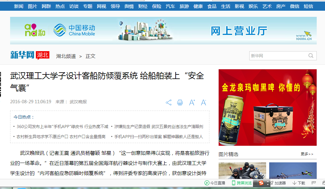 “6·1”东方之星沉船事件后,他指导团队学生围绕内河客船安全问题研发“内河客船应急防瞬时倾覆系统”,获得第五届全国海洋航行器设计与制作大赛“特等奖”好成绩。作品的创新性设计得到主办城市镇江电视台的采访,后续被武汉晚报、楚天都市报、新浪新闻、新华网、长江网、荆楚网等十多家报纸或网络媒体报道或转载,并得到了湖北电视台生活频道、教育频道邀约采访。